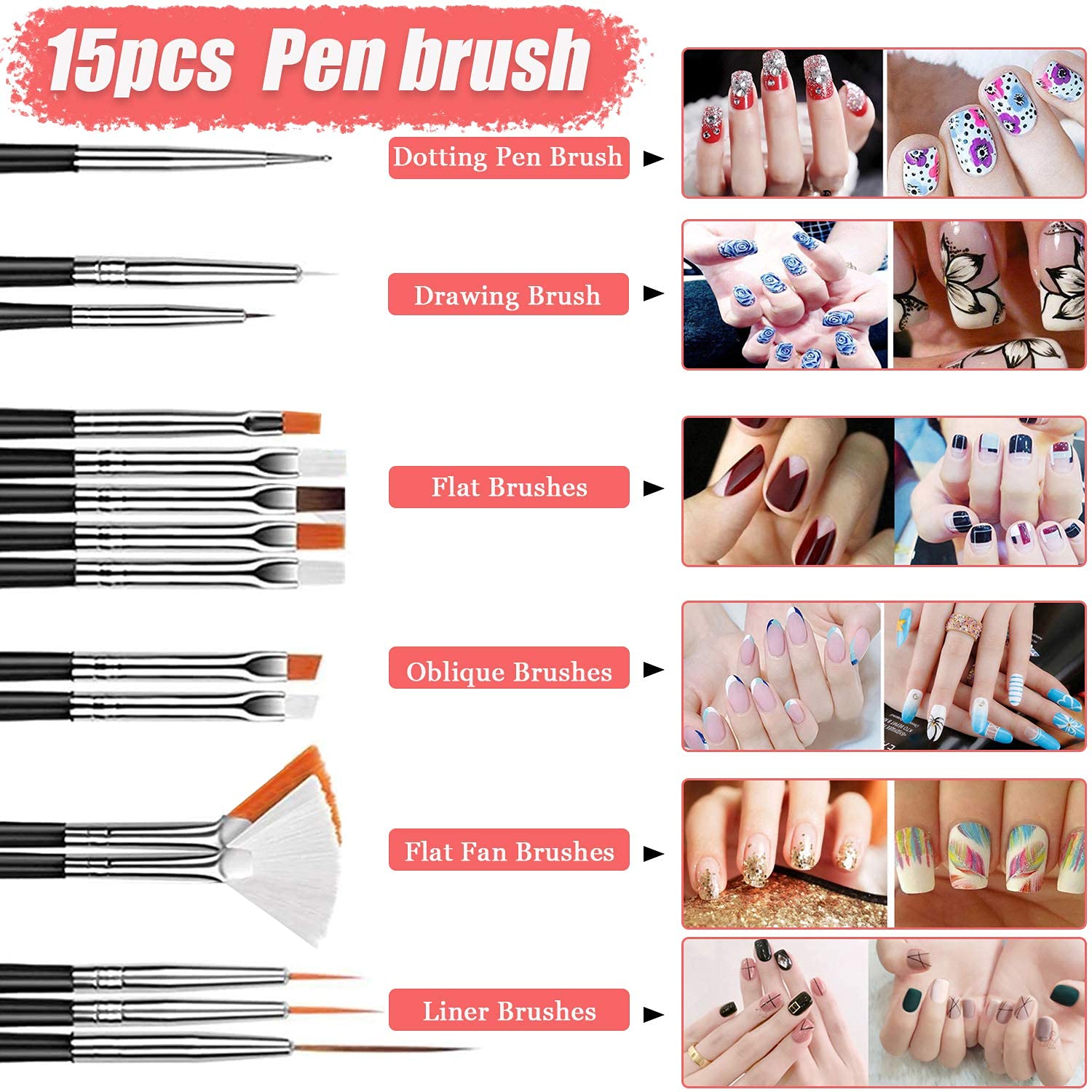 - Includes 15 varied nail brushes for drawing fine lines, dots, and floral designs.