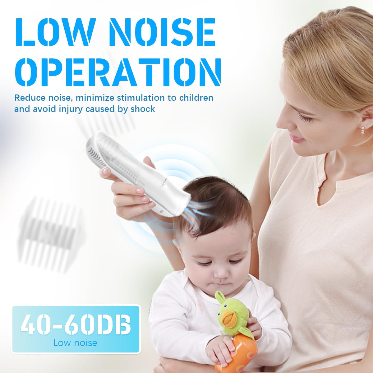 MAYCREATE® Baby Hair Trimmer is a safe and low-noise baby hair clipper designed for babies and kids aged 0–5 years. Equipped with a built-in vacuum and auto hair suction system, it conveniently collects trimmed hair for easy cleanup. The ceramic trimming blade and high-power motor provide precise and gentle cutting while preventing hair pulling. Its waterproof structure allows for simple rinsing, and the USB rechargeable design ensures reliable use at home or while traveling. With adjustable trimmer guards and a cleaning brush, it supports customized grooming for children. This clipper helps parents easily manage their child’s haircuts while delivering trusted performance and convenience from MAYCREATE®.
