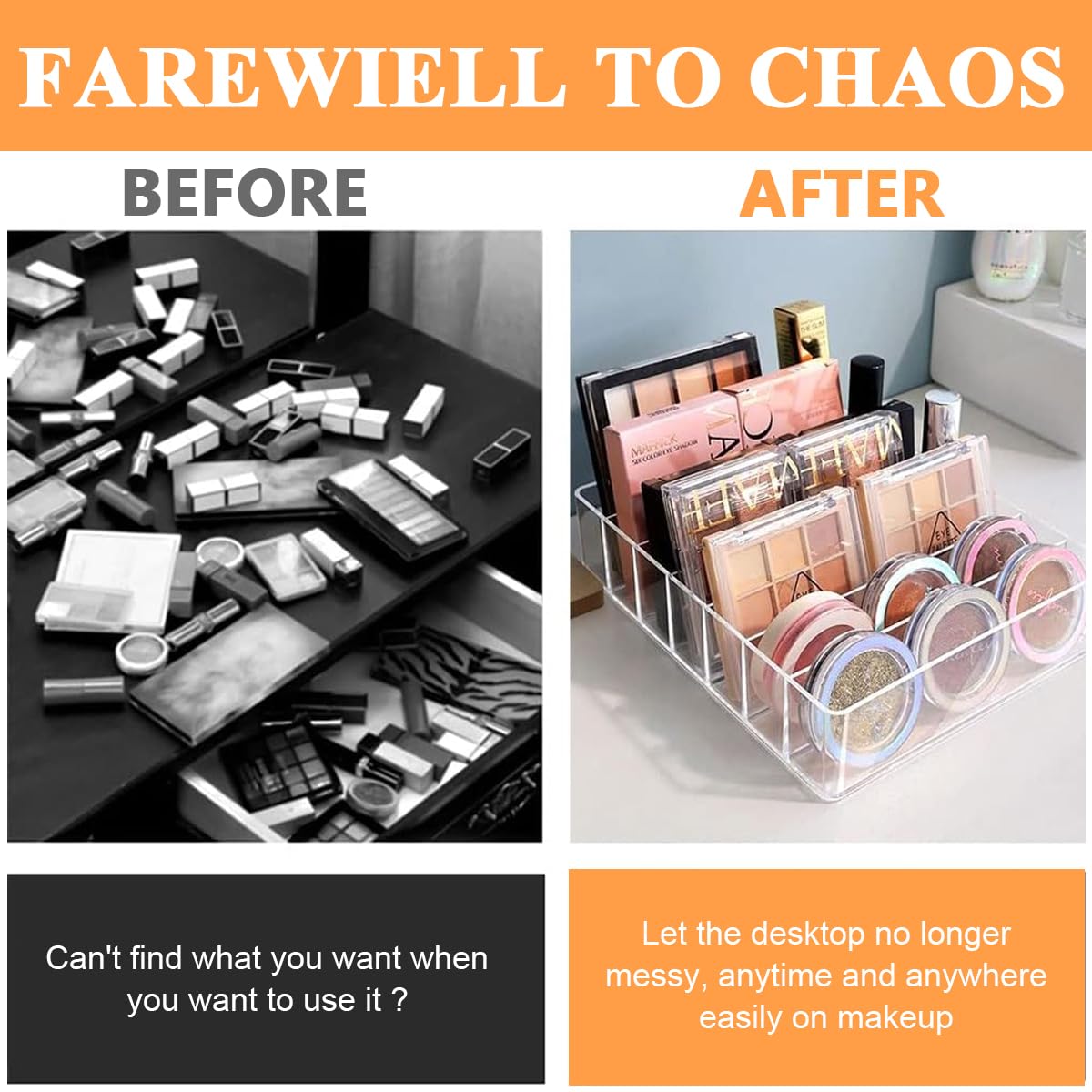 MAYCREATE Make Up Organizers and Storage for Vanity is a clear acrylic cosmetics organizer designed to keep makeup products neatly arranged on a vanity, drawer, or bathroom counter. Featuring seven divided sections with dimensions of 22cm x 19cm x 7.4cm, this organizer provides practical space for various eyeshadow palettes. It can also accommodate blush, concealer, and loose powder, ensuring a versatile storage solution. Made from premium plastic material, the organizer offers durability and long-term use while maintaining an elegant appearance. Ideal for users seeking a tidy and efficient dressing table, it enhances convenience, organization, and access to daily makeup essentials while reflecting the quality associated with MAYCREATE.