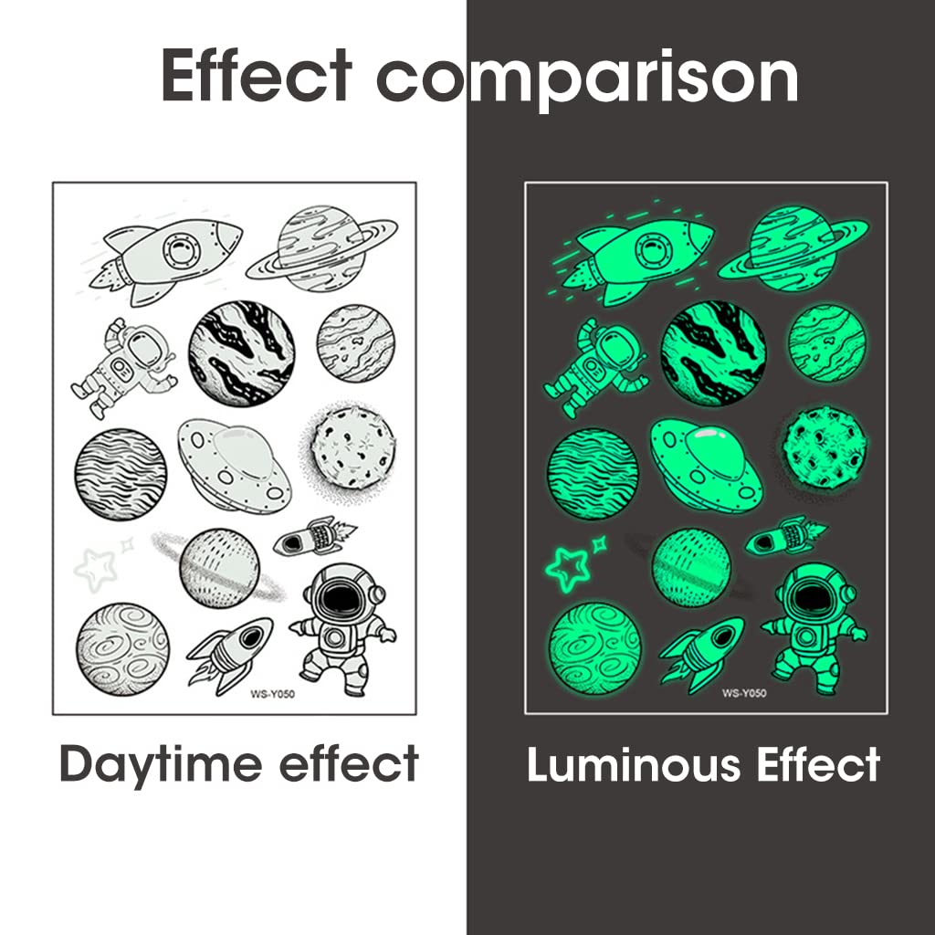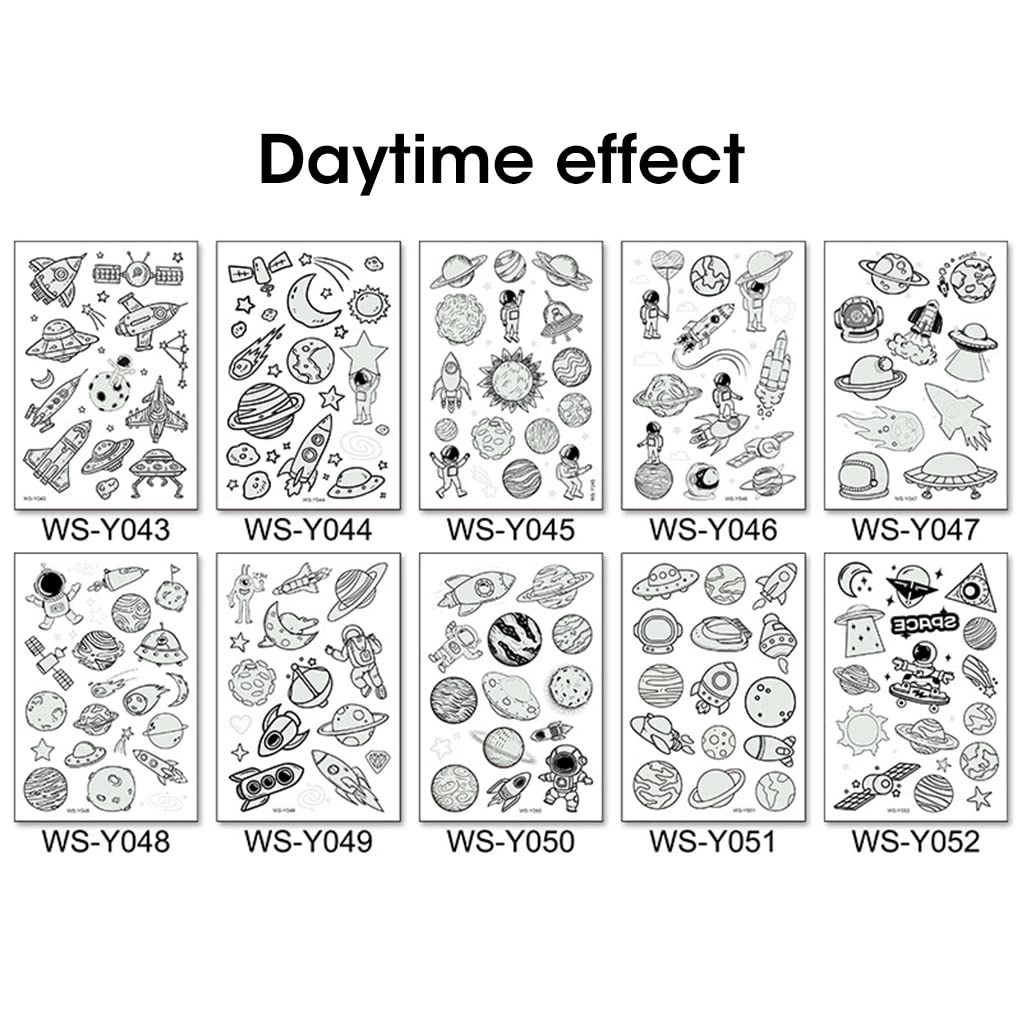 MAYCREATE 10 Sheet Kids Tattoo Sticker Night Glowing Tattoo Sticker features a cartoon space theme with cute astronaut, moon, and star designs, offering a fun way for children to express creativity. Each sheet measures about 110x75mm and includes assorted waterproof temporary tattoos that are breathable, hypoallergenic, and safe for skin. The unique night-glow material absorbs light during the day and emits a glowing effect in the dark, making them ideal for parties or group activities. Suitable for arms, hands, face, and legs, they are easy to apply and remove, providing a lasting effect for 3–5 days. Perfect for birthdays and DIY crafts, MAYCREATE ensures safe, playful, and engaging tattoo art experiences for kids.