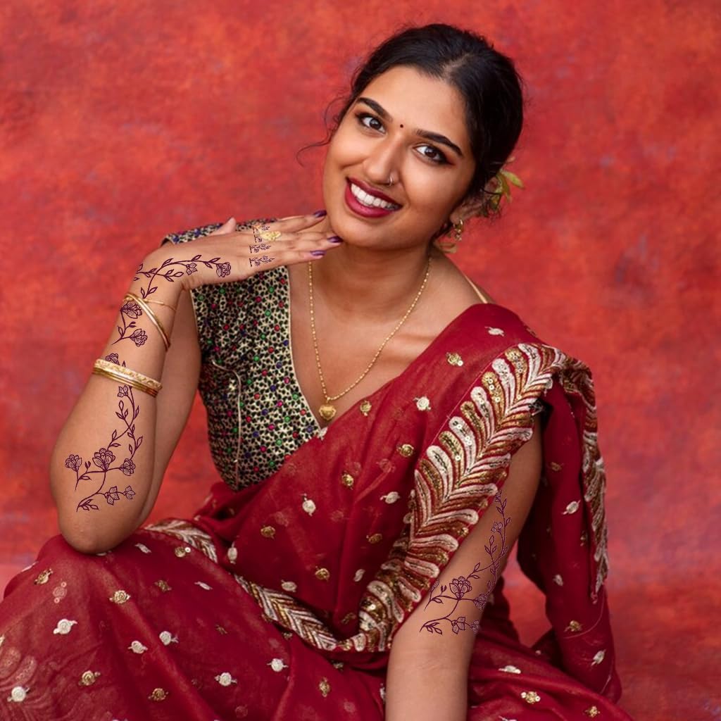 MAYCREATE Temporary Tattoo for Women Girls Brown Lotus Flower Print Mehandi Stickers offer an elegant alternative to traditional henna art, providing a natural and refined look for hands, arms, and feet. These waterproof mehendi tattoo stickers feature diverse floral and natural-inspired designs that mimic authentic henna hues while being safe for all skin types. Crafted from non-toxic materials, they ensure comfortable wear and easy removal without irritation. The stickers are quick to apply and maintain their vivid color for up to seven days due to their durable, waterproof finish. Ideal for festivals, parties, or everyday expression, MAYCREATE delivers a creative, skin-safe way to enjoy temporary body art with confidence and style.