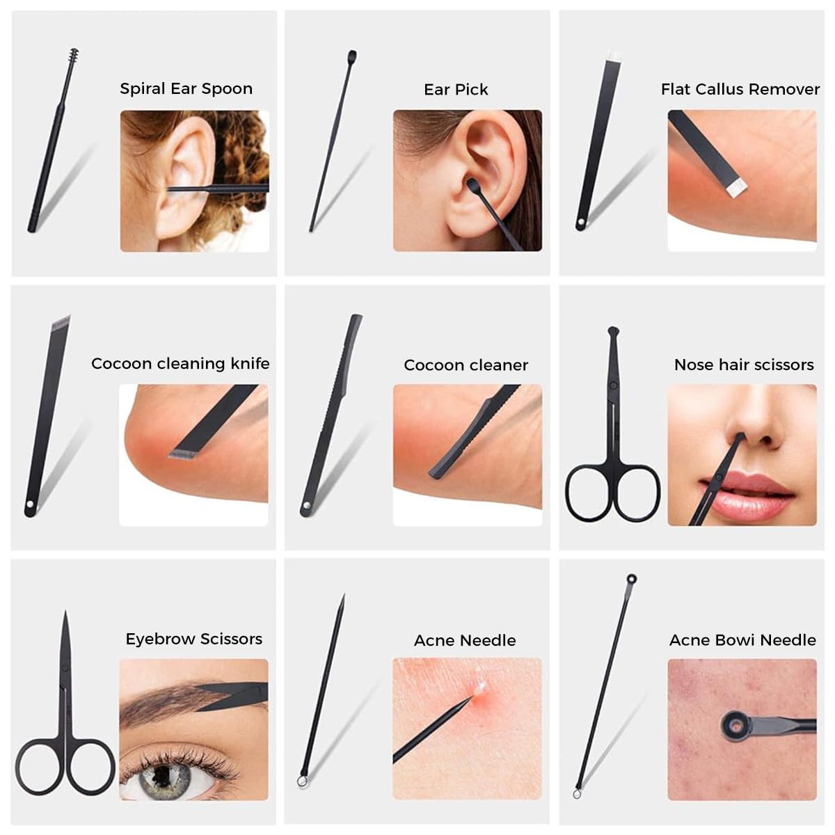 • Includes 18 essential tools for manicure, pedicure, and facial care routines.
