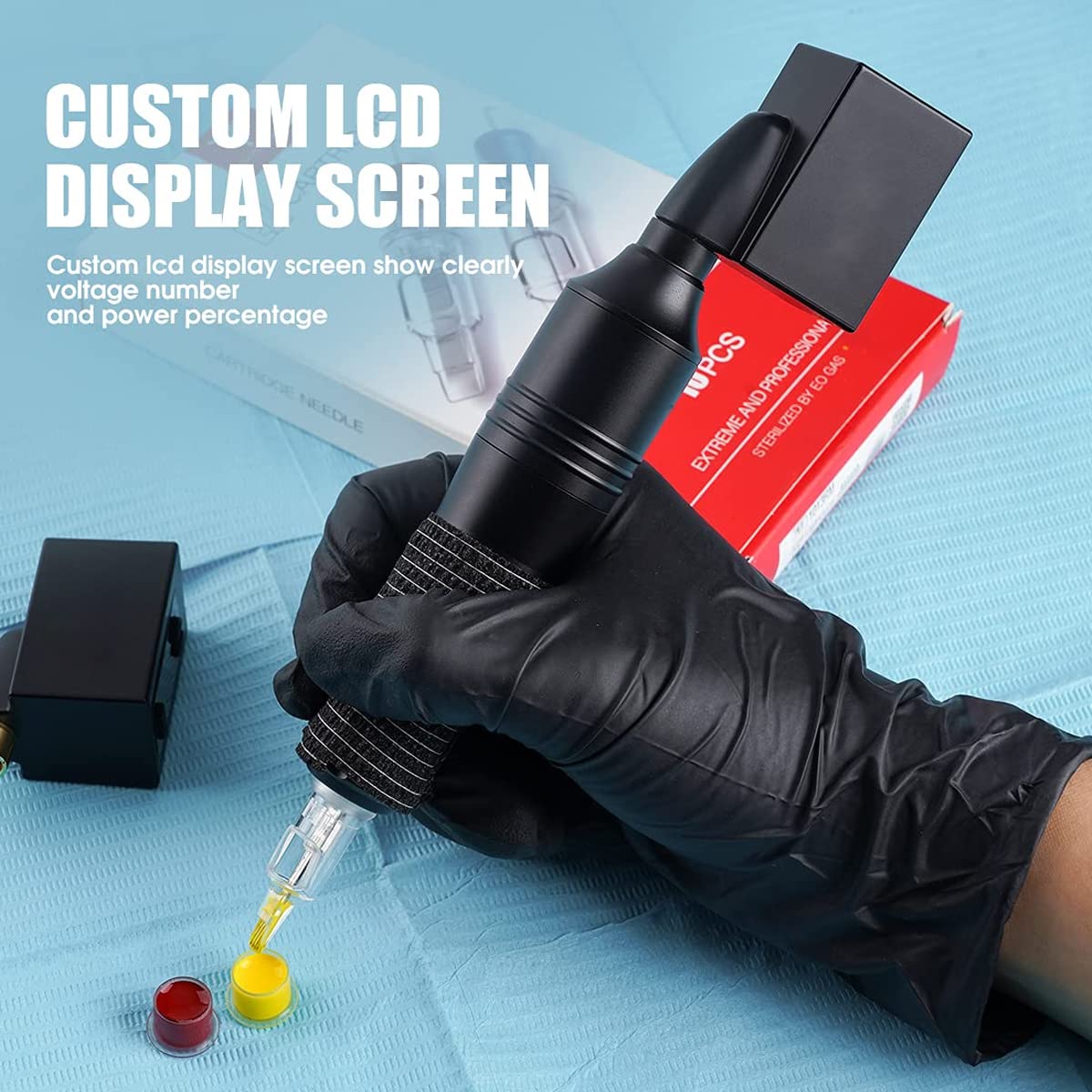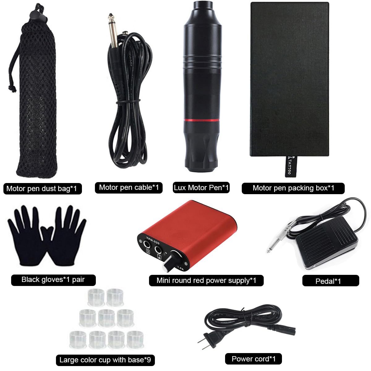 - The complete tattoo pen kit includes gloves, power supply, cables, pedal, and accessories for a ready-to-use setup.